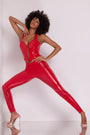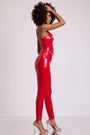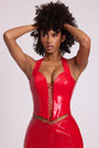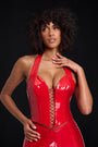 • Vinyl Halter Neck Lace Up Corset Crop Top in Fire Red