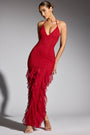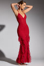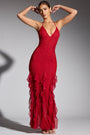 Embellished Halter Neck Ruffle Maxi Dress in Red