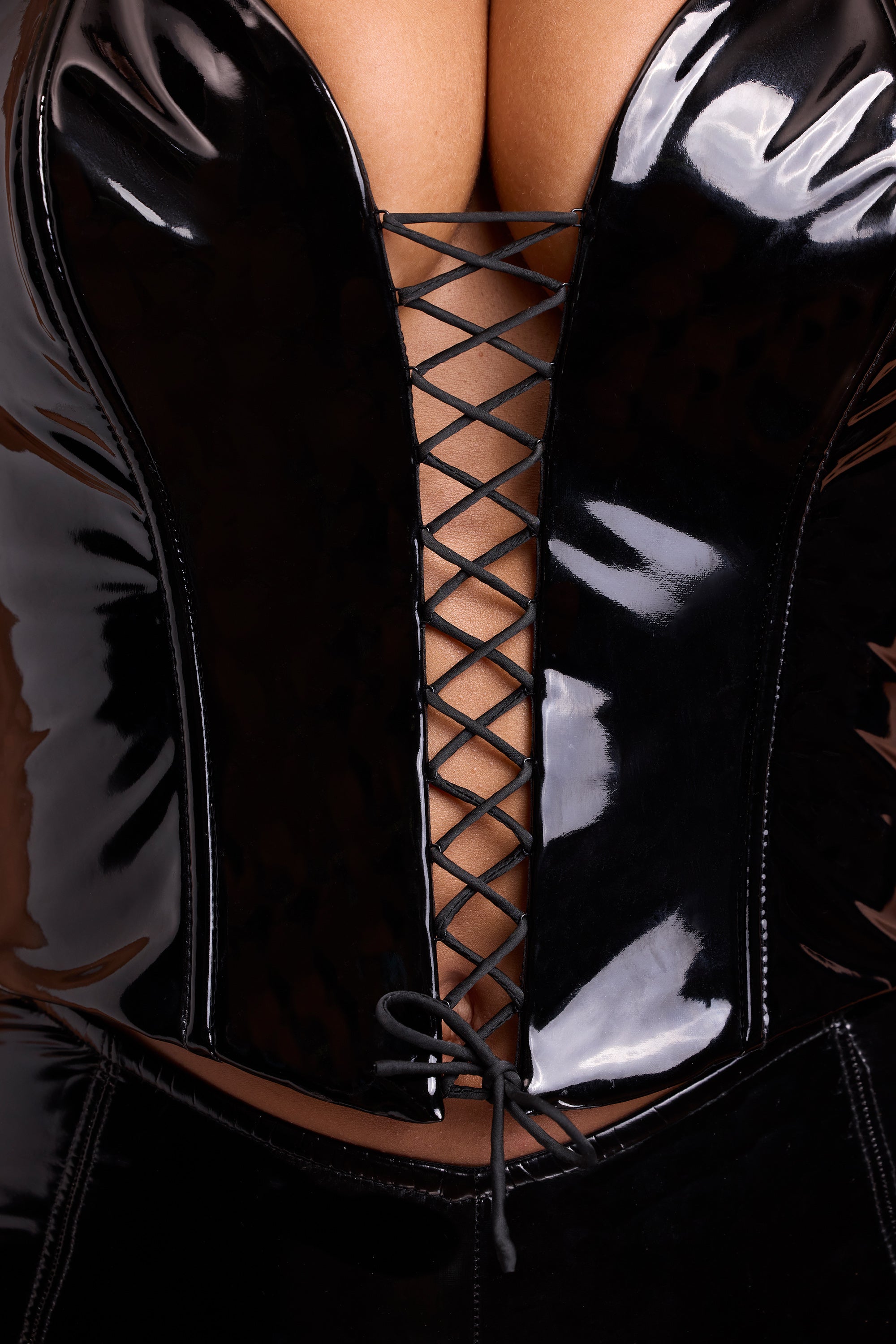 Vinyl Halter Neck Lace Up Corset Crop Top in Black